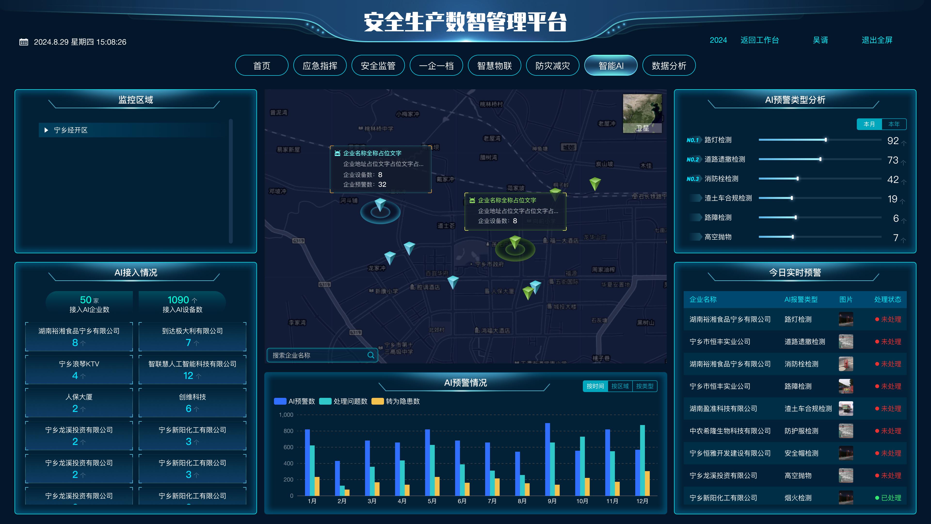 通過“智能AI”數據看板,隨時查看轄區(qū)內各企業(yè)每日警情,AI預警情況,針對預警類型進行智能統(tǒng)計分析,直觀展示每月每年高頻違規(guī)類型和數量。