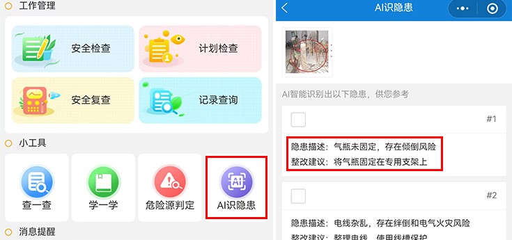 系統(tǒng)內(nèi)置“AI識(shí)隱患”功能,現(xiàn)場(chǎng)隱患圖片拍一拍,利用AI識(shí)圖一鍵出結(jié)果,對(duì)應(yīng)隱患描述、整改建議一目了然,安全小白也能輕松上手。自動(dòng)生成隱患排查單,支持添加多條隱患、在線編輯、復(fù)制、刪除。