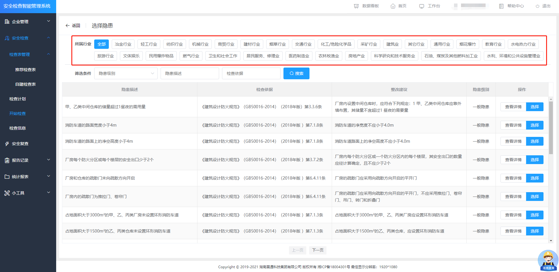 適用于獨(dú)立企業(yè)內(nèi)部開(kāi)展安全檢查工作 依據(jù)企業(yè)所屬行業(yè)及細(xì)分專業(yè)匹配數(shù)據(jù)庫(kù) 實(shí)現(xiàn)不同維度數(shù)據(jù)統(tǒng)計(jì)與分析 |