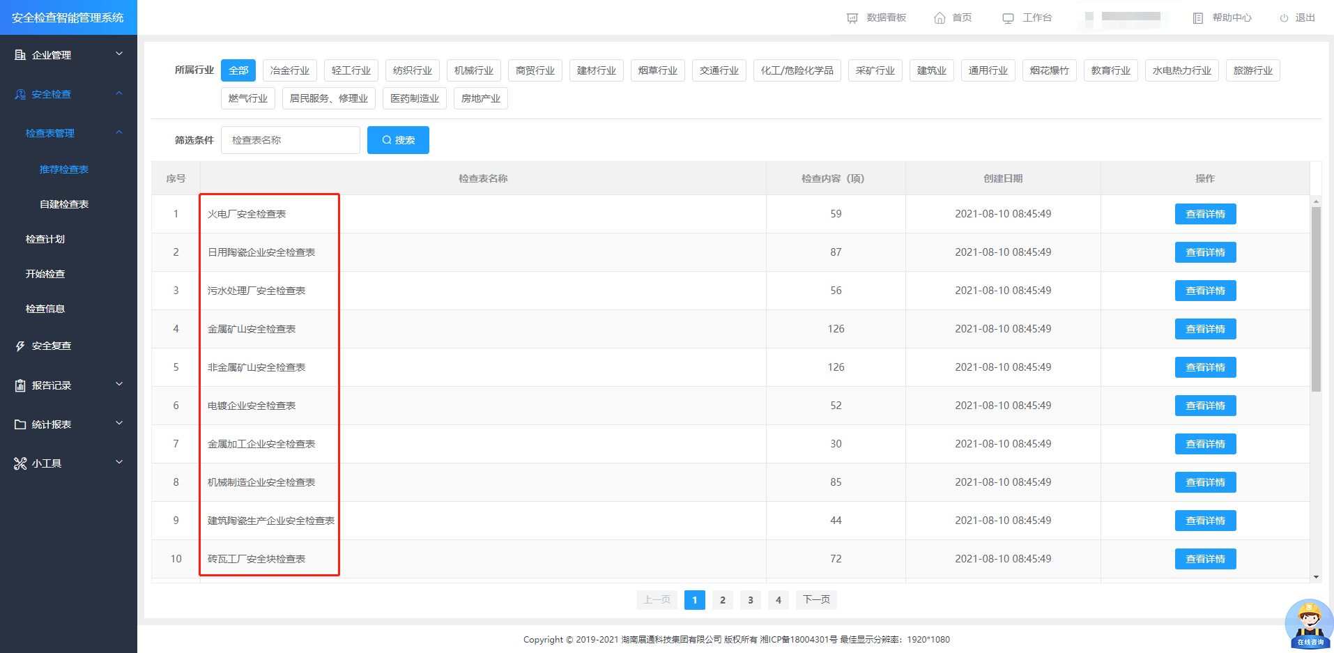 系統(tǒng)內(nèi)置“推薦檢查表”,涵蓋八大工貿(mào)、化工、建筑等多個(gè)行業(yè),可為安全檢查提供全面精準(zhǔn)的檢查項(xiàng)目,實(shí)現(xiàn)“清單式”檢查,有效解決問(wèn)題點(diǎn)發(fā)現(xiàn)不全,檢查不全面等問(wèn)題。