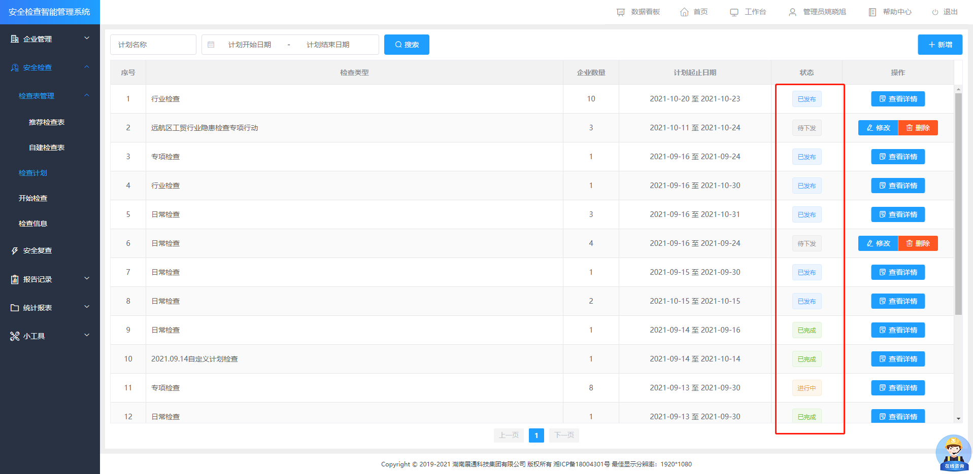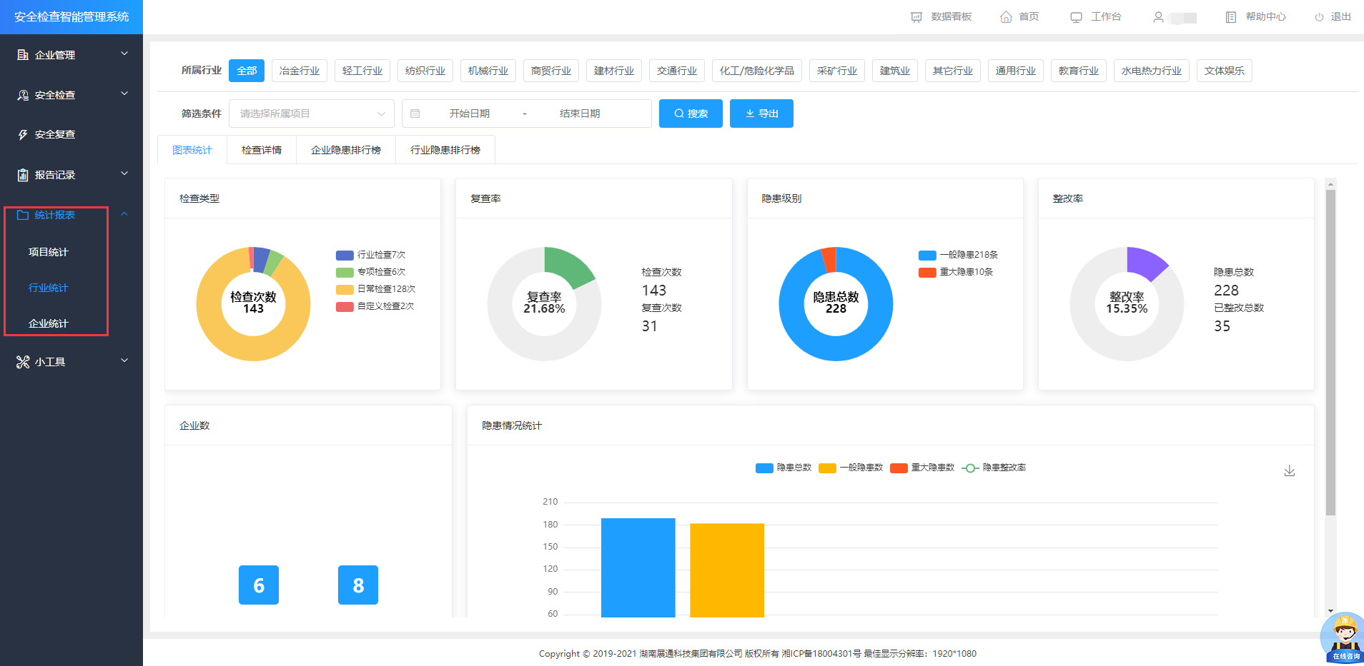 第三方機(jī)構(gòu)版、政府監(jiān)管版支持按行業(yè)、項(xiàng)目及企業(yè)等多維度進(jìn)行安全檢查情況數(shù)據(jù)統(tǒng)計(jì)與分析,為負(fù)責(zé)人管理決策提供精準(zhǔn)的數(shù)據(jù)支撐。