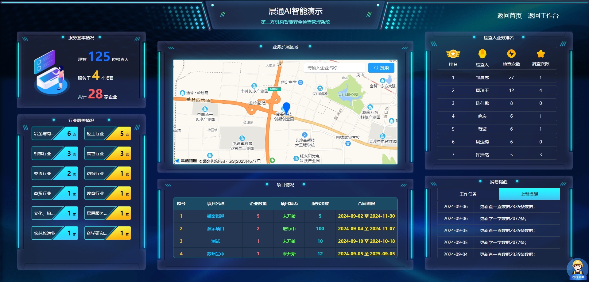 全面整合安全檢查工作業(yè)務(wù)數(shù)據(jù),比如檢查和復(fù)查情況、隱患整改率等統(tǒng)計(jì)、企業(yè)安全檢查工作開(kāi)展排名、人員安全檢查工作執(zhí)行排名、檢查計(jì)劃實(shí)施進(jìn)度等一目了然,為有的放矢地開(kāi)展安全檢查工作提供數(shù)據(jù)支撐。