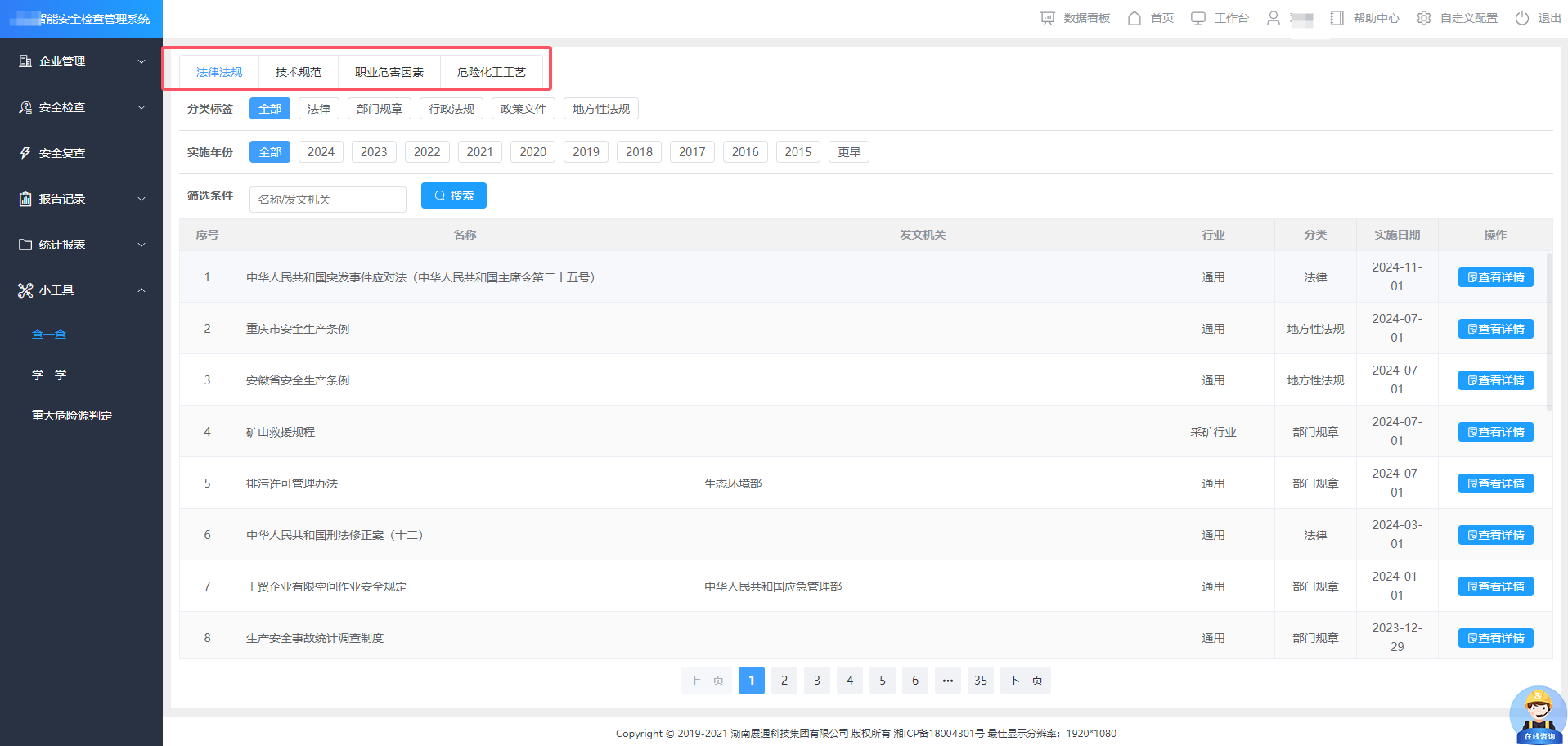 系統(tǒng)內(nèi)設(shè)“查一查”、“學(xué)一學(xué)”功能,提供法律法規(guī)、技術(shù)規(guī)范、危險(xiǎn)化工工藝、職業(yè)危害因素、安全知識(shí)庫(kù)、事故案例庫(kù)等便捷查詢,快速輔助安全人開(kāi)展安全檢查工作,彌補(bǔ)個(gè)人專業(yè)知識(shí)短板。
